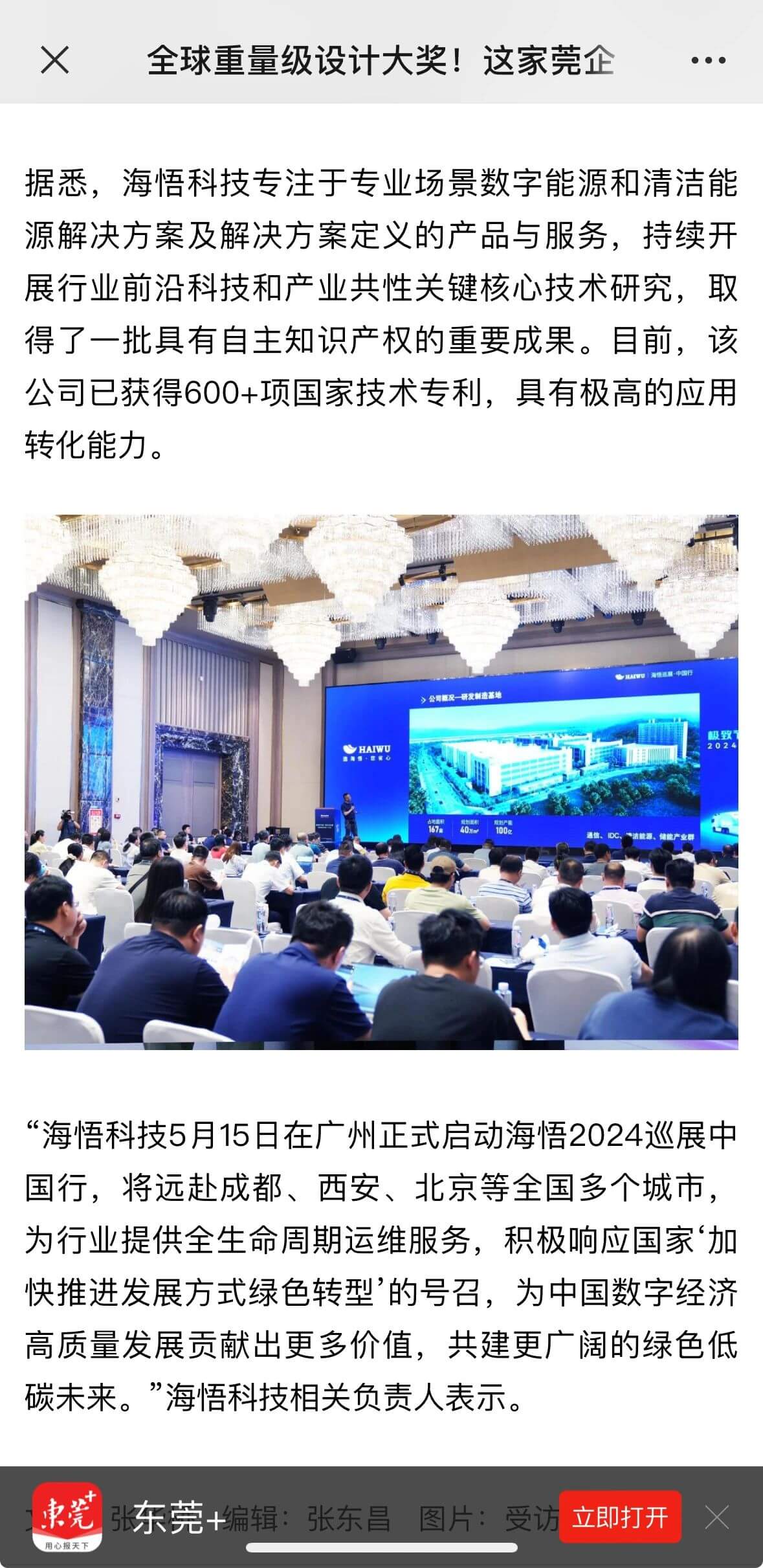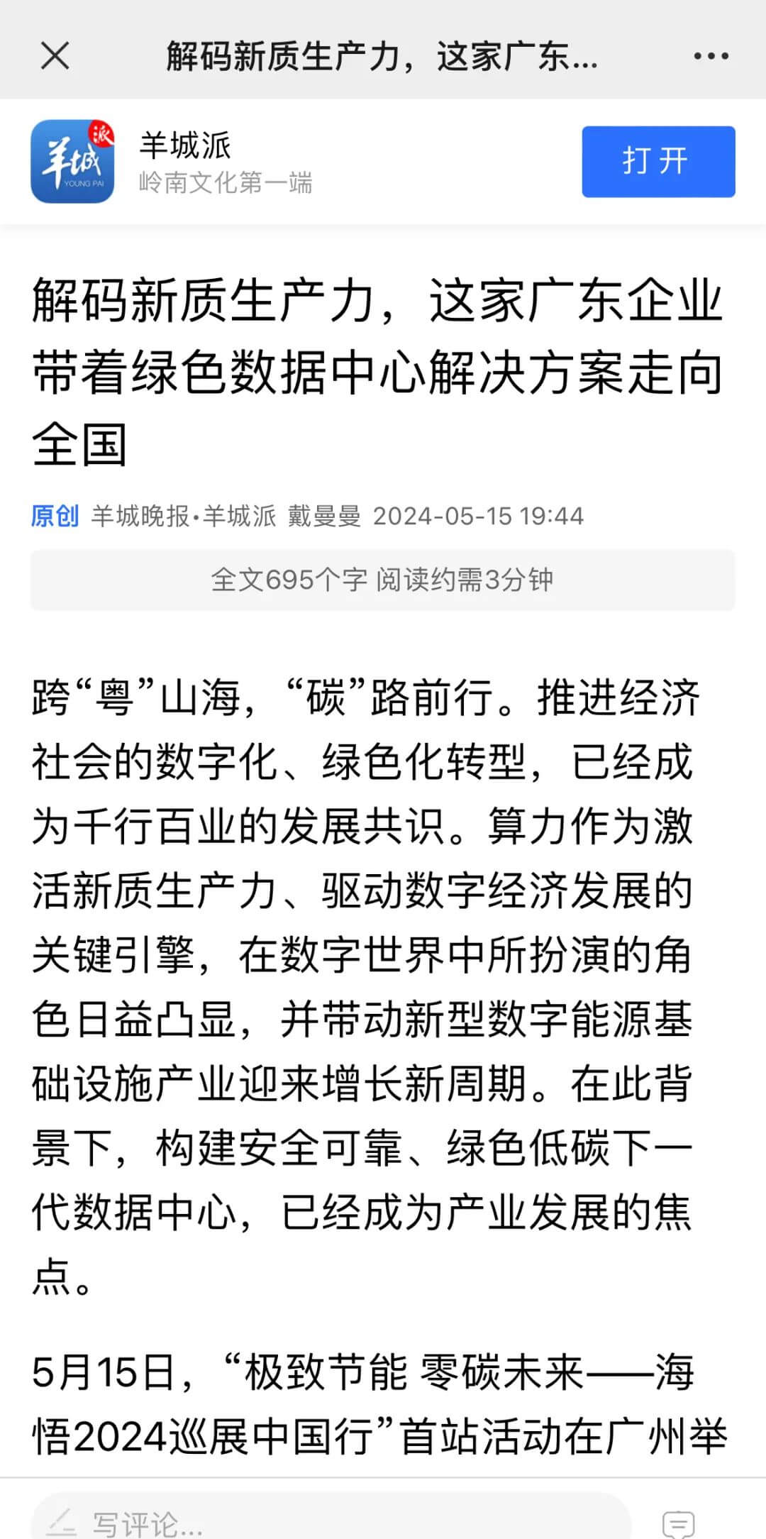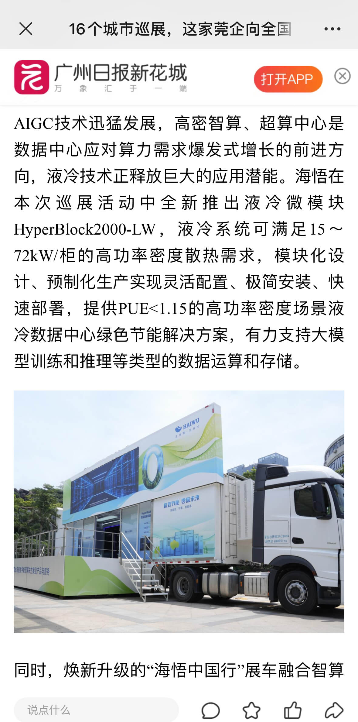 5月15日,“極致節能 零碳未來——2024海悟巡展中國行”首站活動在廣州舉行,攜先進數據中心綠色解決方案走向全國,羊城晚報、廣州日報、東莞+、佛山+等主流媒體關注并報道,海悟的品牌實力、解決方案能力及解決方案定義的產品與服務都受到社會更廣泛的認可。