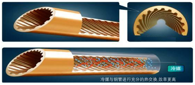 需要進(jìn)一步強化耐高寒空氣源熱泵的內(nèi)部換熱,縮小應(yīng)傳熱推動力不足而擴(kuò)大的冷凝溫度與蒸發(fā)溫度的差值,提高主機的?效率。由于更低環(huán)溫對應(yīng)更低的冷媒蒸汽壓,相應(yīng)造成氣相部分在蒸發(fā)器管道內(nèi)的流速增加,但同時又受到摩擦阻力和聲速限制,更會造成蒸發(fā)器管道內(nèi)壁的換熱效能未被充分發(fā)揮。因此,需要為蒸發(fā)器選擇新型的管材,比傳統(tǒng)帶梯形槽的強化換熱管或者更早期采用的光管,更有利于在高寒地區(qū)工作。