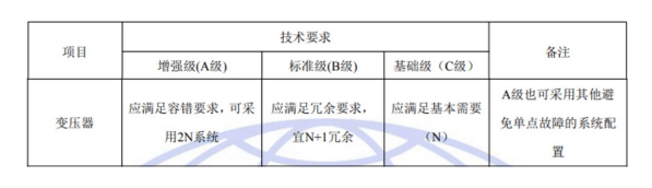 國標GB50174-2017《數(shù)據(jù)中心設計規(guī)范》中對于A、B、C三級數(shù)據(jù)中心變壓器架構(gòu)的具體要求如下:
