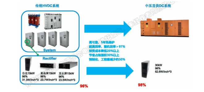 數(shù)據(jù)中心劃分為許多功能區(qū),隨著IT機架功率密度的提高,輔助區(qū)域占地面積比例也越來越高。在輔助區(qū)域中供電設施的占用面積最大,據(jù)統(tǒng)計,中壓變配電設備、低壓配電設備、電能質(zhì)量處理設備、不間斷電源設備、電池設備及其輔助系統(tǒng)占地面積一般超過數(shù)據(jù)中心機柜面積的50%以上,隨著單IT機柜功率增加,其比例更高,這部分供電設備嚴重擠占了IT機柜的可用面積。