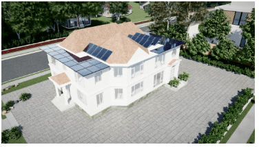 原有住宅建筑屋頂系統(tǒng)為采用深色大波紋瓦覆蓋的多面坡結(jié)構(gòu),歐式風(fēng)格突出,不宜粗魯?shù)卮蚱啤D媳眰?cè)外擴(kuò)部分,為實(shí)現(xiàn)發(fā)電、產(chǎn)熱的功能而采用平鋪方式,雖不盡完美,但對(duì)整棟住宅的觀瞻影響相對(duì)較小,方案在可接受范圍。