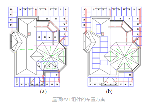 原有屋面系統(tǒng)上2處坡度安裝的PVT組件,則過(guò)于突兀,對(duì)建筑外觀破壞過(guò)大;且位于小平臺(tái)上的4塊PVT組件采光條件復(fù)雜,在系統(tǒng)中又與南向坡面的4塊PVT組件同處一個(gè)組串,相互干擾,影響系統(tǒng)效率。因此,重新考慮將其布置于東向和西向坡屋面上,如下圖b,雖然也對(duì)建筑觀瞻有一定負(fù)面影響,但隨著近些年公眾對(duì)屋面光伏系統(tǒng)的接受度越來(lái)越高,屋面上整齊敷貼布設(shè)的光伏板已經(jīng)成為業(yè)主前衛(wèi)新潮、崇尚環(huán)保的新標(biāo)簽。屋頂小平臺(tái)建議恢復(fù)為屋頂花園景觀,提升整個(gè)建筑的靈動(dòng)感。