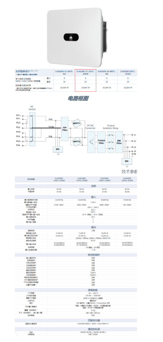 光伏并網(wǎng)逆變器選型:選用華為SUN2000-25KTL。