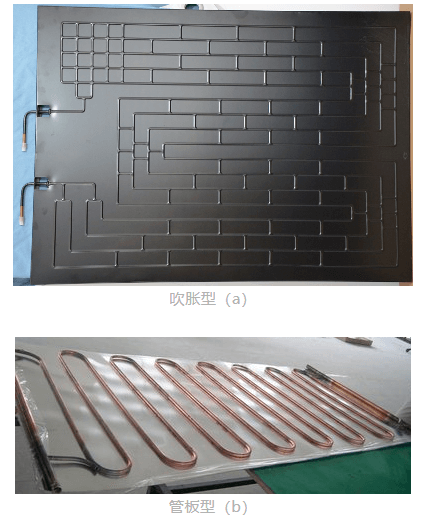 從制造工藝上,最常見(jiàn)的換熱板有吹脹型(a)和管板型(b),見(jiàn)下圖: