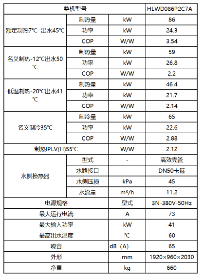 空氣源熱泵主機(jī),選用海悟HLWD086P2C7A空氣源熱泵機(jī)組1臺(tái),該機(jī)組低溫工況制熱量(-12℃)為59kW、COP為2.2,極端氣候或地源熱泵系統(tǒng)故障時(shí),可作為供暖熱源備份;額定制冷量65kW,滿(mǎn)足本項(xiàng)目夏季制冷的需求。