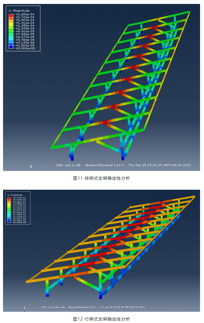 為驗證支架整體的穩定性和承載能力,通過ABAQUS有限元軟件對支架進行仿真。根據《建筑結構荷載規范》及《光伏發電站設計規范》,以河南鄭州項目為例,該地區25年基本風壓為0.38kn/m2,通過本文4.1條調整后風壓取值0.72kn/m2。通過面荷載施加給支架體系。圖11及圖12分別為排架式和行架式支架整體仿真結果,結果顯示風壓產生的結構橫梁最大位移分別約0.19mm、0.49mm,小于橫梁計算跨度的1/250,滿足《光伏發電站設計規范》(GB50797-2012)。風壓產生的柱側側移分別為0.1mm、0.36mm,小于柱高的1/60,同樣滿足規范要求。因此結構整體穩定性符合要求。