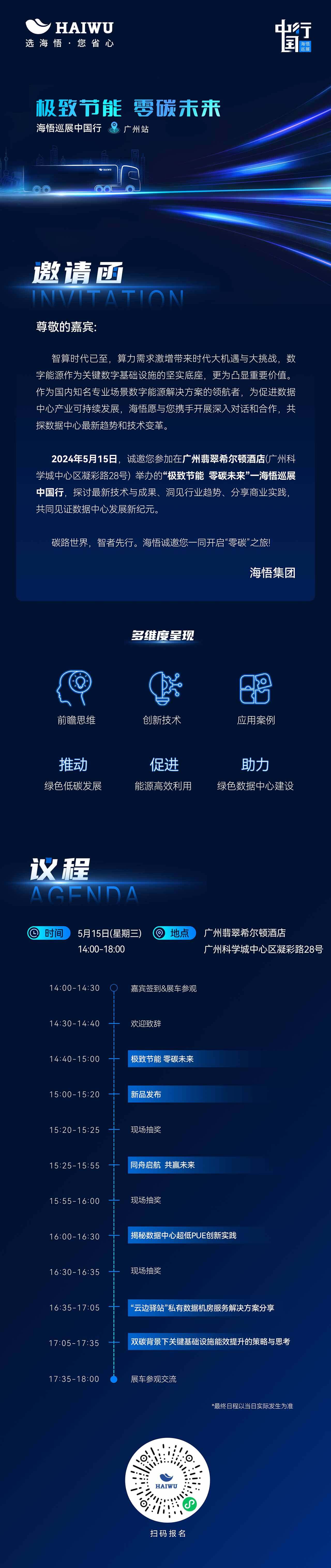 為此,我們誠摯地邀請您參加即將于2024年5月15日在廣州翡翠希爾頓酒店舉辦的“極致節能 零碳未來”-2024年海悟數字能源中國行巡展廣州站。這是一場匯聚了行業精英、聚焦能源未來的盛會,更是一次深入了解海悟品牌、感受綠色科技魅力的絕佳機會。