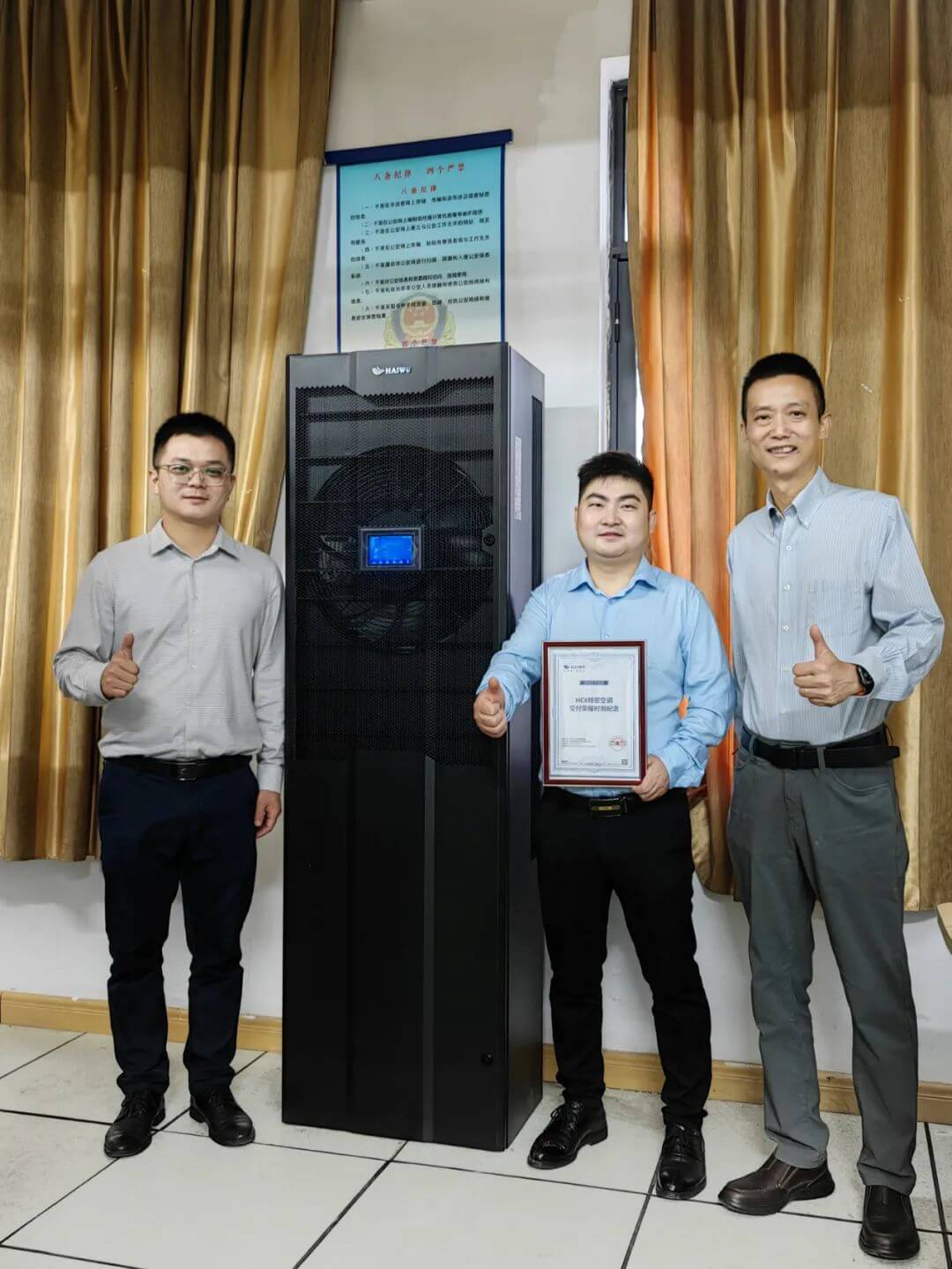 HEX精密空調已在全國范圍批量交付,海悟合作伙伴業務及分銷渠道總監戴勇赴長沙客戶現場,與海悟湖南代表處一起為分銷合作伙伴湖南銀博信息科技發展有限公司頒發了“HEX精密空調交付榮耀時刻紀念”證書。