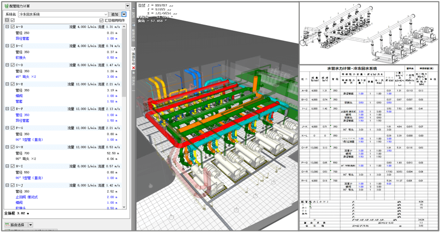 BIM模型進行管道綜合調整優化后,考慮對所選設備進行調優選型,重點在于水泵及風機的阻力校核,指導設備選型、路由優化、閥件優選和連接優化。通過對水系統管道的阻力校核,對水泵的優選做出推薦,同時對管路組件進行優化。