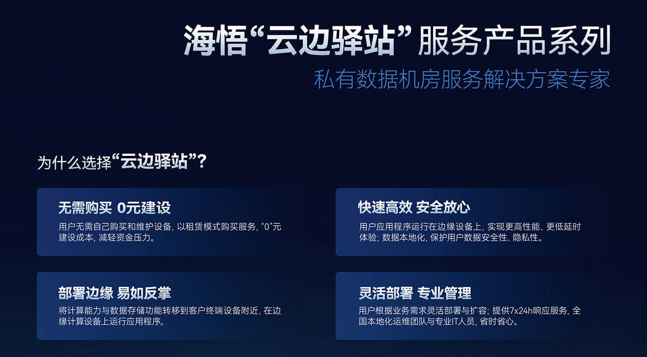 綜上所述,海悟云“云邊驛站”私有數據中心托管服務解決方案,以其卓越的安全性、高效的本地化算力、全方位的服務保障以及靈活的配置選項,正逐步成為企業數字化轉型道路上的堅實后盾。選擇“云邊驛站”,即是選擇了一個值得信賴的合作伙伴,共同開啟企業數據管理與應用的新篇章。