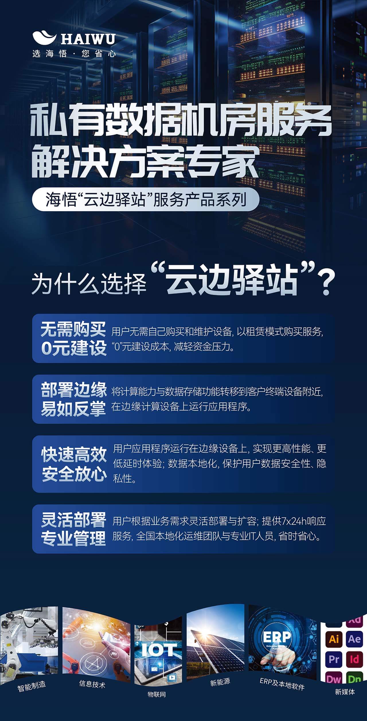 在數字化轉型的浪潮中,企業數據的安全與高效處理成為了核心競爭力的重要組成部分。面對日益增長的數據存儲需求與復雜的IT管理挑戰,海悟云匠心打造“云邊驛站”私有數據中心托管服務解決方案,旨在為企業提供一站式的本地化算力與數據安全存儲方案,讓企業在享受云端便捷的同時,牢牢把握數據主權,專注核心業務的發展。