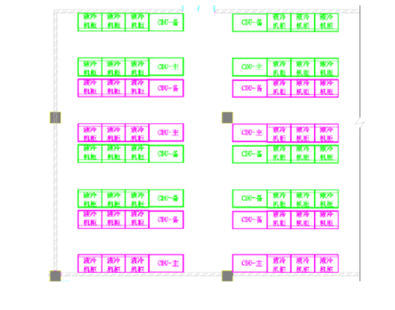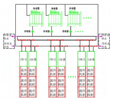 3)將CDU集中布置到一個區域或者集中到幾個有序區域,使液冷設備管路和冷卻水管路有明確的物理分區,一方面可以使各功能區有序布局,另一方面能夠更加簡潔的實現冷卻水管路和閥門冗余設計。