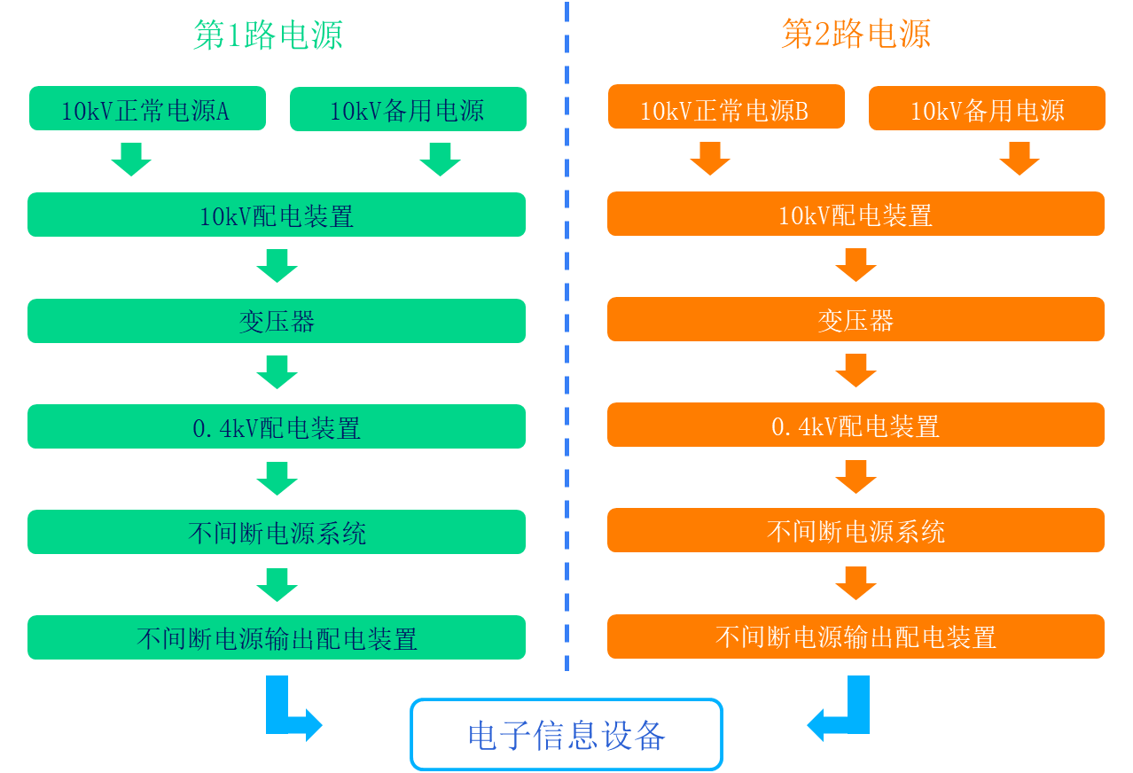 A級數據中心由雙路電源供電,并設置備用電源。正常運行時,數據中心由雙路電源供電,每路電源承擔50%的負荷;當一路電源出現故障,另一路電源承擔全部負荷;當兩路電源都出現故障,備用電源投入運行,承擔全部負荷的需要。