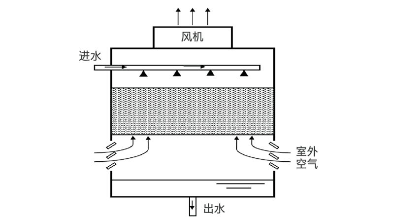 開式冷卻塔經過將循環冷卻水直接噴淋到冷卻塔填料上,同時由風機帶動冷卻塔內氣流流動,通過室外空氣與冷卻水之間的熱質交換蒸發冷卻循環水,冷卻后的循環水在冷卻塔底部出水 (見圖 2)。開式冷卻塔中循環冷卻水與室外空氣存在熱質交換。