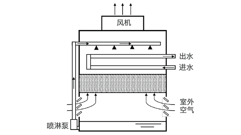 閉式冷卻塔是將管式換熱器置于塔內,通過室外流通的空氣、噴淋水與管內的循環冷卻水進行熱交換而實現向大氣散熱的設備(見圖3)。閉式冷卻塔有內循環和外循環兩個系統,其內循環通過與被冷卻設備對接,構成一個封閉式系統,將系統熱量帶到冷卻塔,也即內循環水通過換熱盤管將熱量傳遞到大氣中;外循環由循環噴淋泵,布水系統、集水盤及管路組成,外循環水不與內循環水相接觸,只是通過冷卻塔內的換熱器吸收內循環水的熱量,然后通過和空氣直接接觸來散熱。
