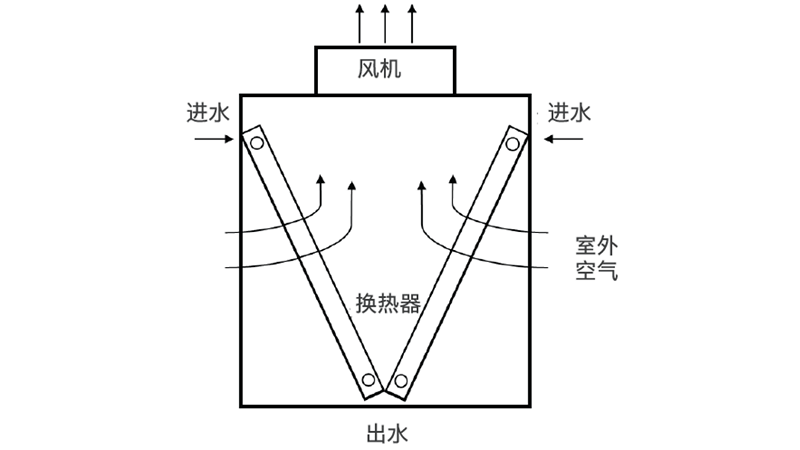 干冷器即干式冷卻器,其工作過程沒有水的消耗,是通過管內走液體與管外走自然風來冷卻管內液體,降低管內液體溫度,達到冷卻的目的 (見圖 4)。干冷器中的載冷劑通常使用乙二醇溶液,需要根據項目地冬季極端溫度選取溶液濃度。