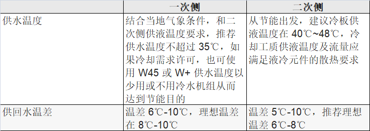 一次側冷源有多種組成形式,需根據當地室外環境溫度 (包括干球 / 濕球溫度) 及液冷服務器的進液溫度,確定是否需要下調水溫;另外供水溫度應比室內露點溫度高出 2℃ ~ 3℃ 左右,以防結露 (見表 1)。