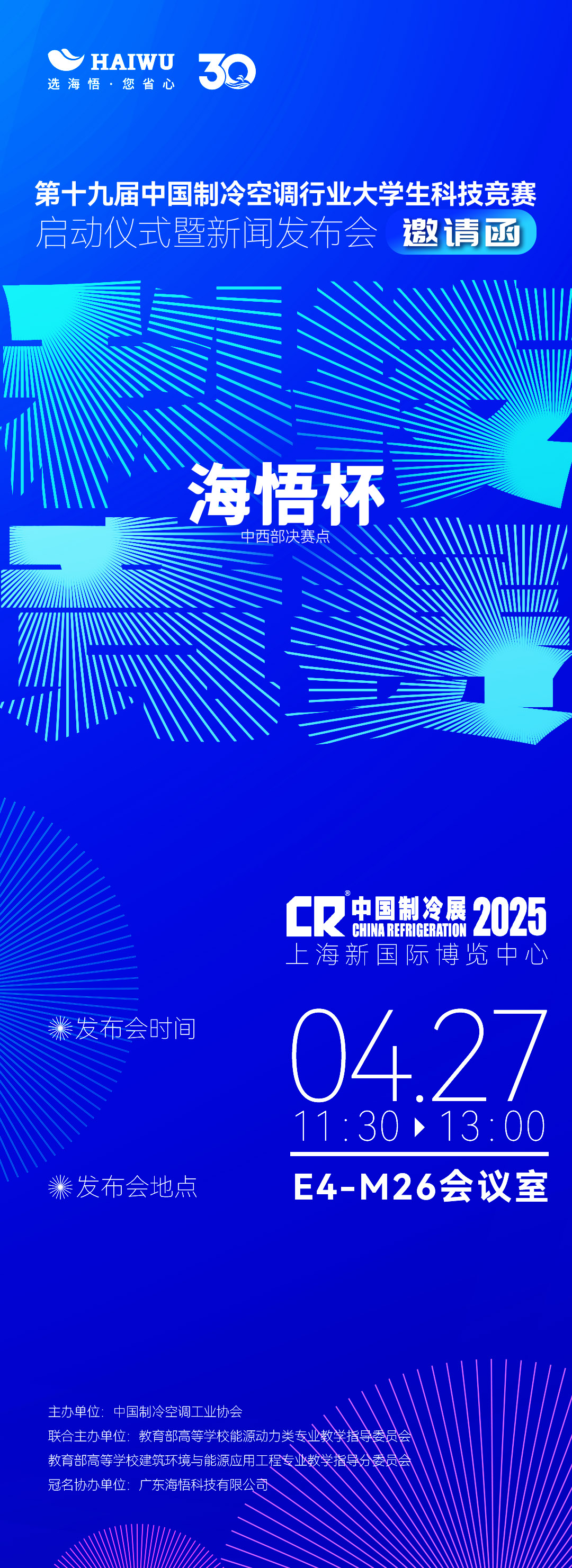 2025 年 4 月 27 日,在第三十六屆國際制冷、空調、供暖、通風及食品冷凍加工展覽會(“2025 中國制冷展”)期間,于上海新國際博覽中心,一場意義非凡的啟動儀式暨新聞發布會盛大舉行 —— 由廣東海悟科技有限公司贊助協辦、中國制冷空調工業協會聯合舉辦的 2025 第十九屆中國制冷空調行業大學生科技競賽正式拉開帷幕。
